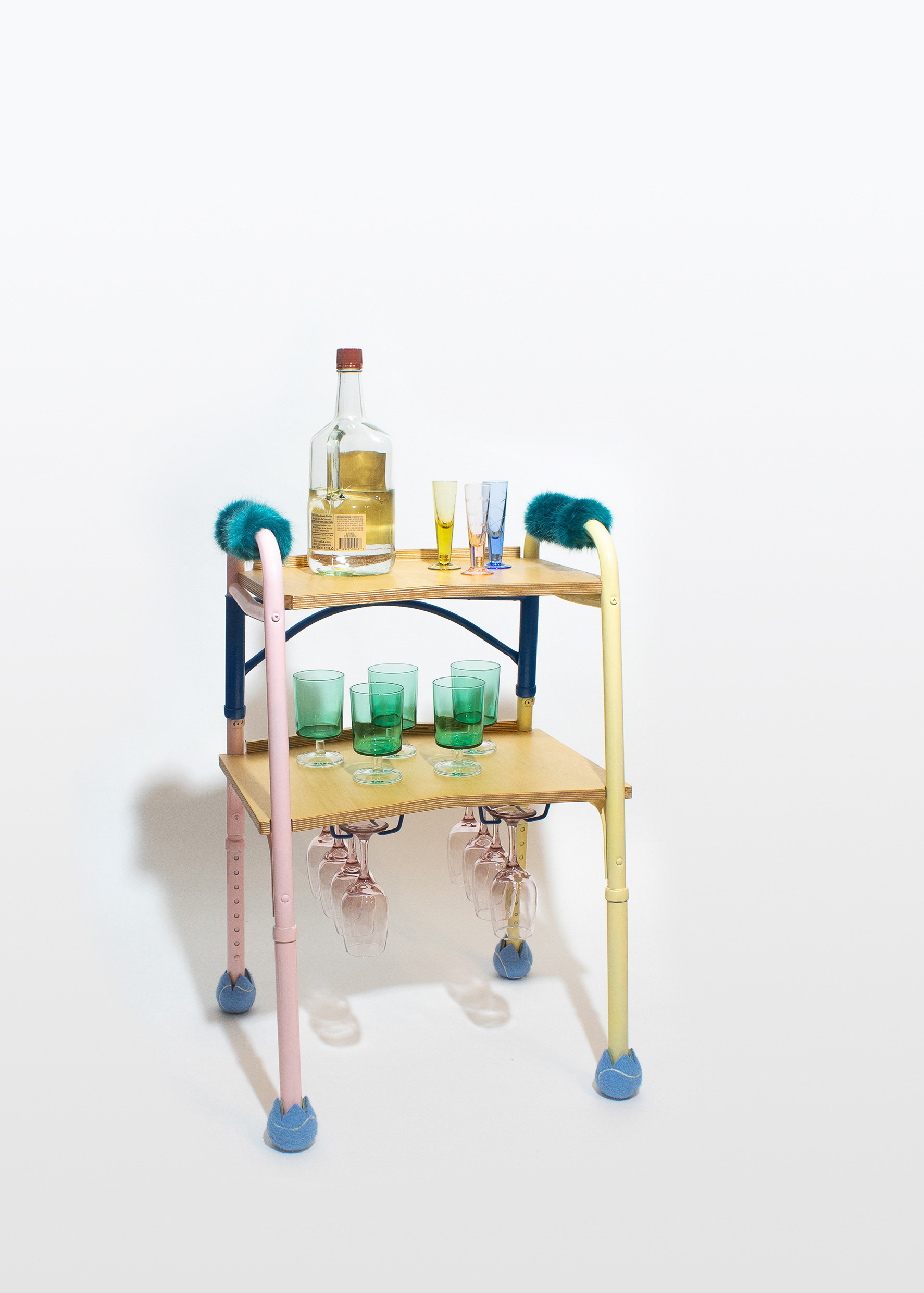 Johnnie is a bar cart made using a walker and plywood to be both functional and emotionally engaging.